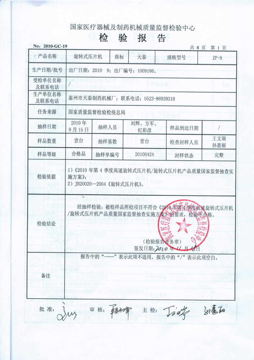天泰牌ZP-9旋轉(zhuǎn)式壓片機(jī)抽檢符合JB 20020-2004標(biāo)準(zhǔn)要求