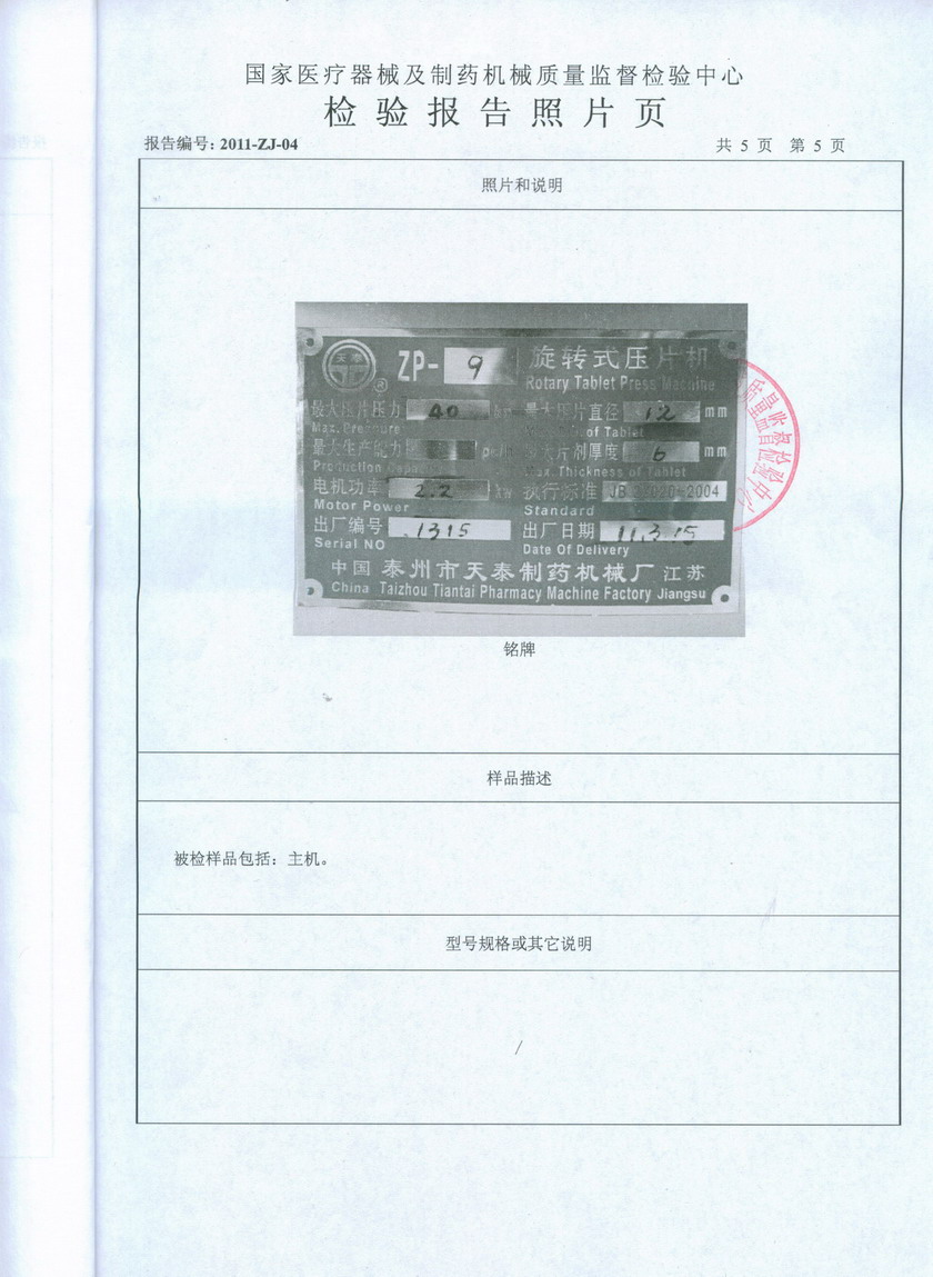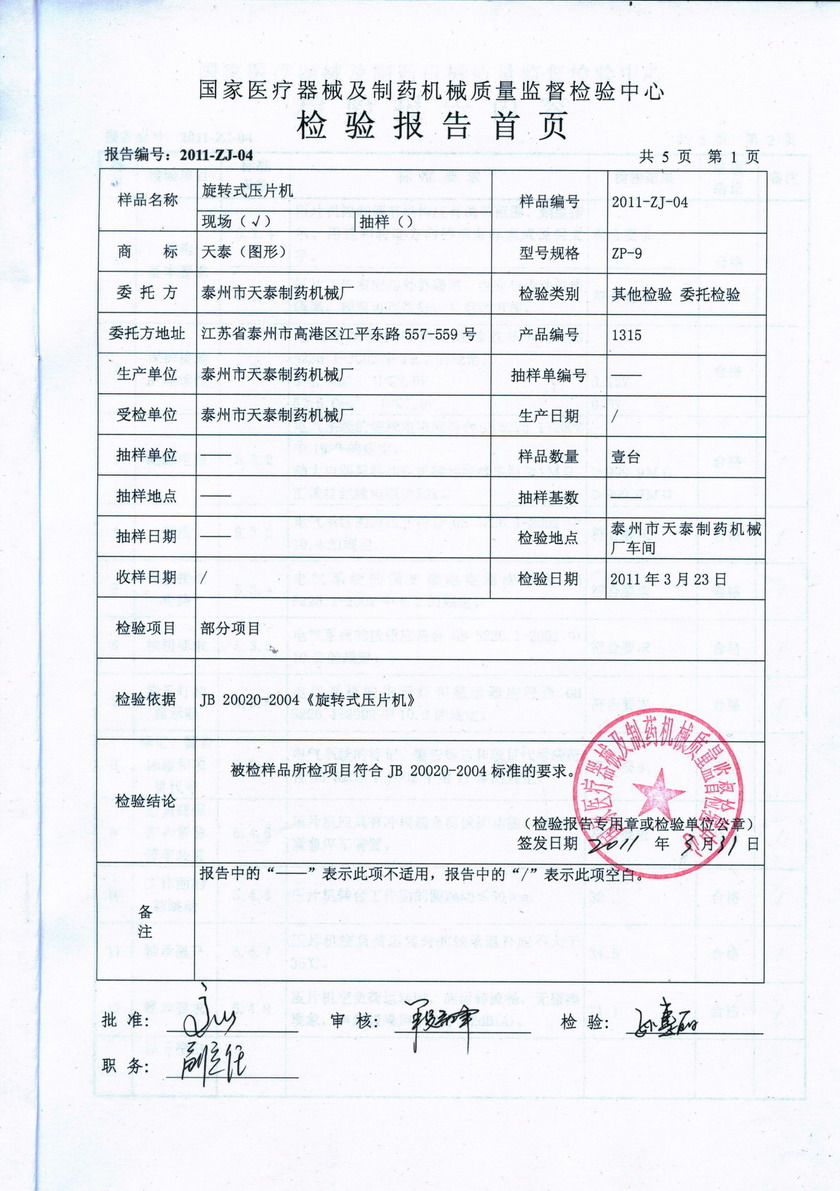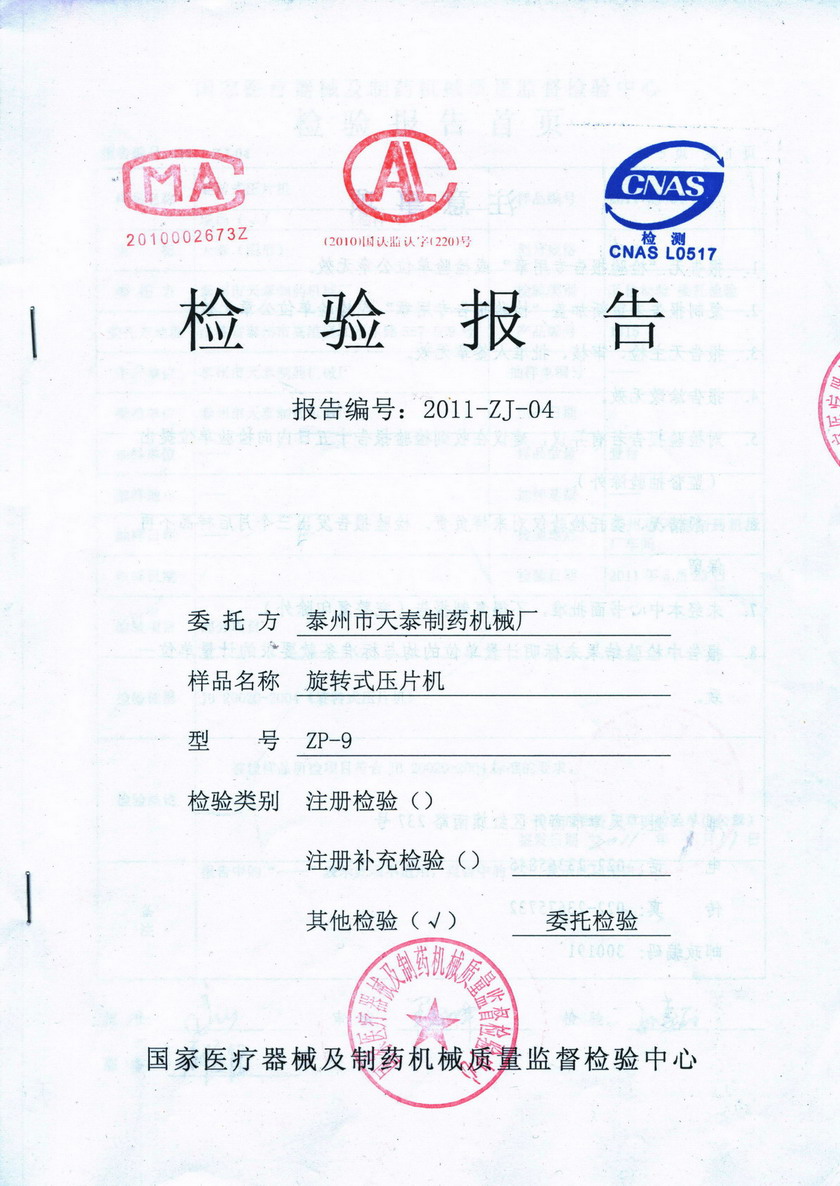 天泰牌ZP-9旋轉(zhuǎn)式壓片機(jī)抽檢符合JB 20020-2004標(biāo)準(zhǔn)要求
